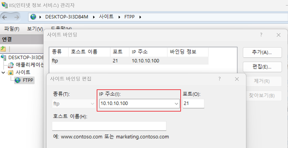 IIS 관리자 > FTP 서버 우클릭 > 바인딩 편집 > IP 주소 편집