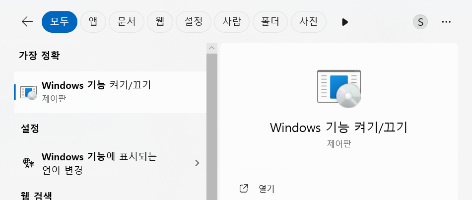 작업표시줄의 검색창에서 Windows 기능 켜기/끄기 실행