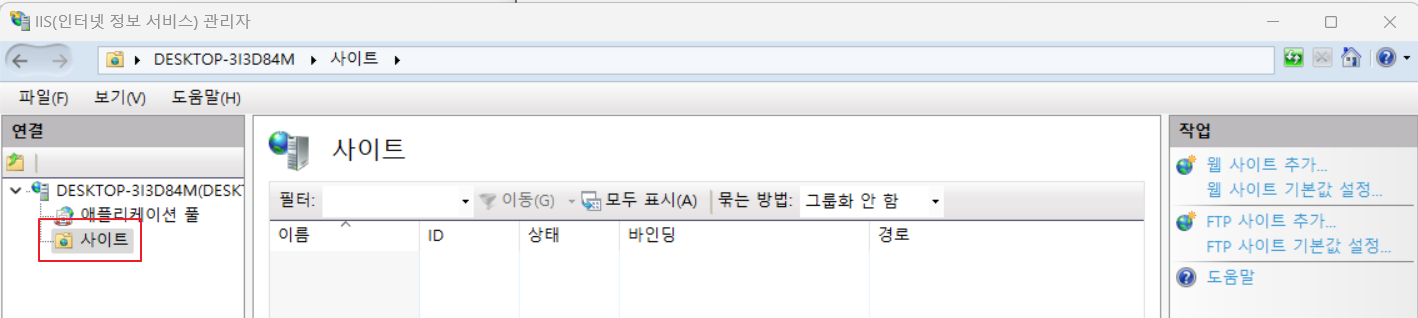 검색창에서 IIS 관리자 실행 후