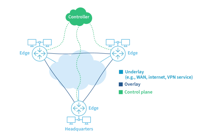 | Overlay | Underlay 위에 형성된 가상의 사설망으로, SD-WAN이 이 경로를 통해 트래픽을 통제한다. |