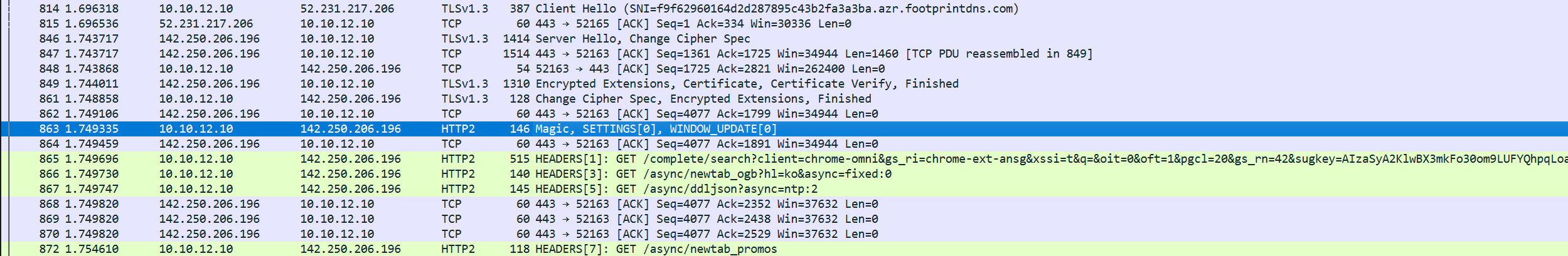 client hello 이후 핸드셰이킹을 수행하고, 키 교환이 끝난 후부터 http로 복호화된 통신 과정을 확인할 수 있다.