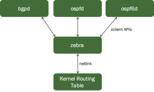 각 라우팅 프로토콜 데몬들이 최적의 경로 정보를 계산하여 zebra에게 전달하면, zebra는 이를 취합하여 최종적으로 커널 라우팅 테이블에 반영한다.
