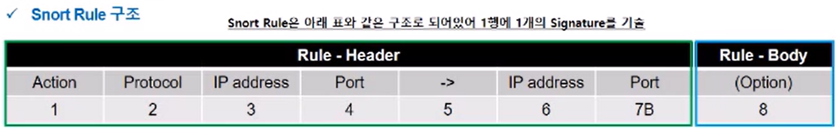 - Snort rule은 헤더와 옵션 구조로 이루어져 있다.
